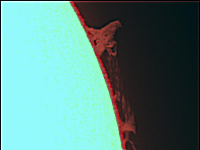 Mount: Vixen SXD2 StarBook One Camera: ZWO ASI183MC bin 1x1 Filter: DayStar Combo Quark (Chromosphere) Exposure: 60 frames, Best 20%, d=0.319 Processing: ImagesPlus 6.5 Location: MHO Date: 23-Jul-2023 |